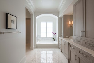 The exterior of this French Villa style home features an antique cream clay tile roof, painted board and batten shutters with antique hardware, and a colored concrete driveway with decorative grass bands. The first-floor open concept plan includes a living room with a masonry fireplace with stone surround, custom chevron patterned European white oak floors, and a custom cove ceiling trim. The interior space opens to a covered loggia and intimate garden with room for a future cocktail pool. The kitchen features custom cabinetry, a stacked stone backsplash, slate farm sink, and a vintage cast iron AGA range. Natural stone countertops provide both a task surface and an eat-in breakfast table in the kitchen. A large dining room boasts coffered ceilings with wood slat trim, and large windows which bring an abundance of natural light into the space. The finished basement houses a large wine cellar with secondary living and dining space, custom wine shelving, and a bar area perfect for entertaining. The basement also features a secondary bedroom suite with full bath and closet. On the second floor, the master suite features a sitting room with coffered ceiling details and custom window shelving and reading benches. The master bedroom features 13’-8” ceilings with clerestory windows to bring in natural light. A masonry fireplace with stacked stone surround carries from floor to ceiling. The master bath boasts his and her vanities, stone mosaic floors, and a large shower for two. A tray ceiling, custom cabinetry, and polished nickel plumbing and lighting fixtures bring exquisite finished detail to this space.