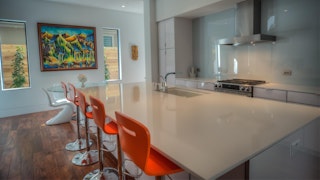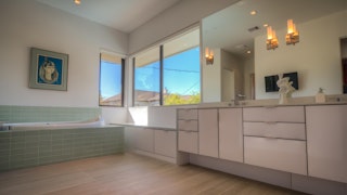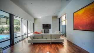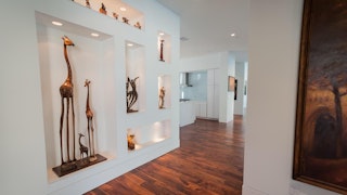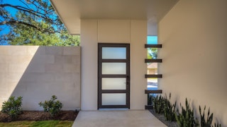 A contemporary home designed with the display of collected art and sculpture in mind. The home has a courtyard garden entry where when one enters through the perceived front door of the home, they are actually in an entrance garden courtyard before entering through the actual front door. The floor plan is an open floor plan with the Kitchen opening to the Family Room Space. The family room opens up not only to the views of the front garden courtyard, but to the pool and large backyard, making it easy to see all outdoor spaces. All bedrooms are located on the second floor.