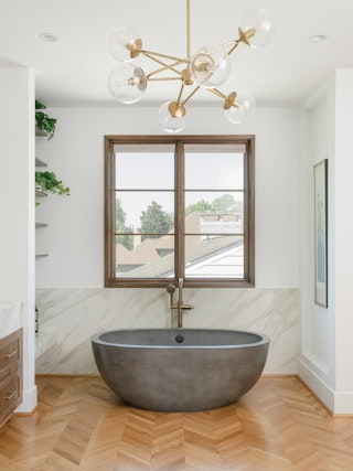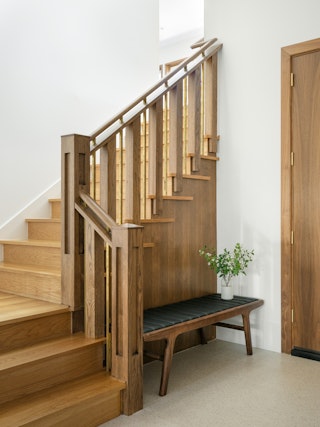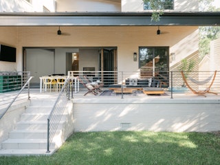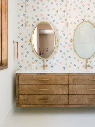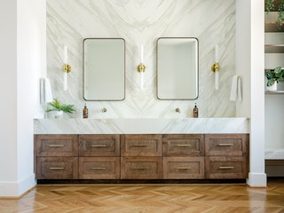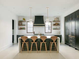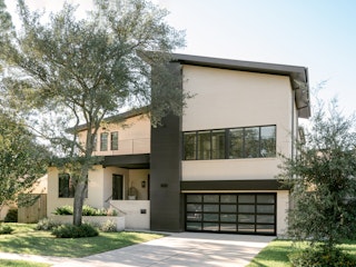 After their home flooded during Harvey, our homeowners desired to build a brand new home on their existing lot. Mirador Group stepped in to create a mid-century/Frank Lloyd Wright-inspired design that would be lifted out of the flood zone and would keep their family safe for future flood events. The home has a ground-level garage, raised first floor, intermediate level, second floor, and a media room tucked into the roof eaves. Elongated brick integrated with wood siding elements create a warm and modern feel. Windows abound throughout the space to give maximum natural light to the interior of the home. A full-height wall-to-wall glass and wood door retracting system in the Living room allows for indoor-outdoor connectivity. Inside, each space is customized for the homeowner using color, pattern, and metallic touches. A dramatic black dining room features custom ceiling trim and a feature wet bar with metallic accents in the tile and cabinetry. The staircase features a custom handrail with wood and brass detailing, and the office boasts similar wood and brass details in the integrated cabinetry and ceiling. The primary bathroom features large porcelain marble-look slabs at the vanity backsplash, tub surround, and shower surround. A stone tub takes prominent position as you walk into the primary bath. The children's suites are customized with touches of pastel and blush pink, with brass and crystal accents.