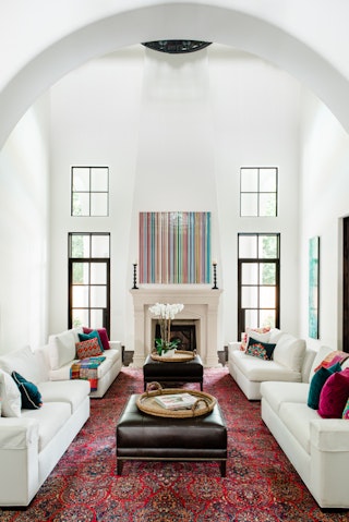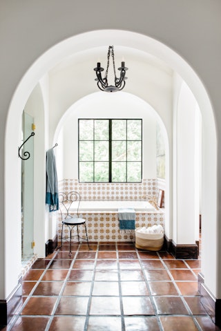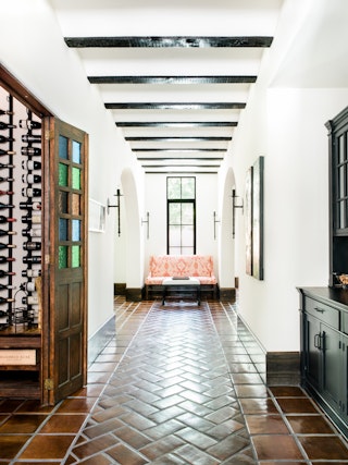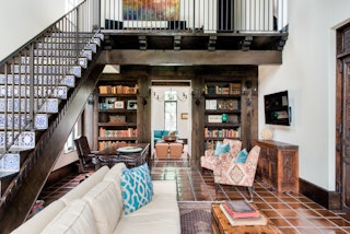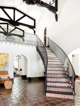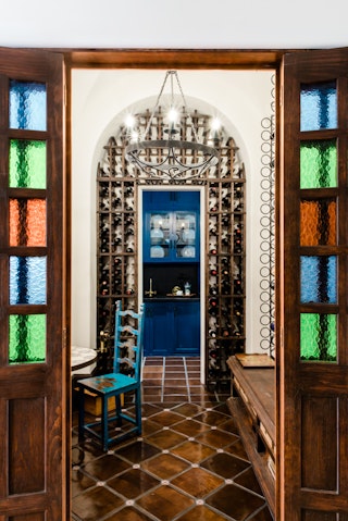 Neumann Residence is a new-construction custom home, designed in the traditional Spanish Revival style. Custom touches are prevalent throughout, including ceiling trim designed after Spanish cathedrals, handcrafted Saltillo and Talavera tiles, custom millwork and lighting, and reclaimed stained glass wine room doors. The grand entrance features 30 foot ceilings with cedar wood trusses which are open to the family room beyond. Three staircases have custom iron handrails and Talavera tile risers. A two-story library features the client's antique book collection. The kitchen features a custom copper table, marble countertops and backsplash, and a La Cornue range and hood. A large wall of doors (by Mirabella Doors) opens completely between the kitchen and loggia to allow for the interior and exterior to join into a large entertaining space.